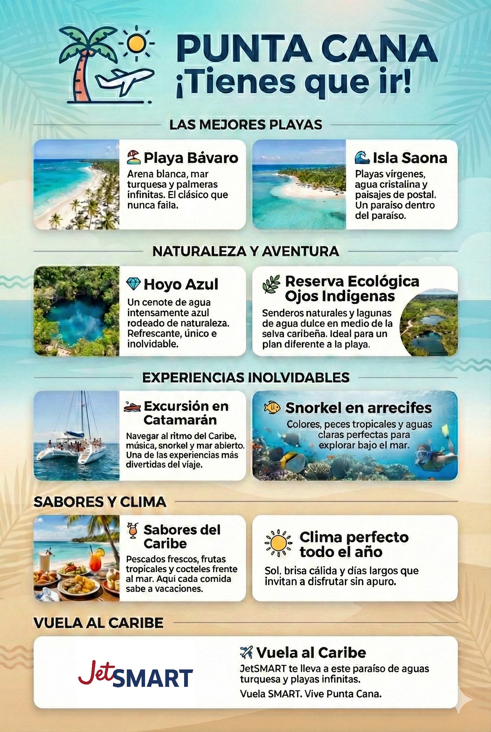 R/: Además de disfrutar del mar, puedes hacer excursiones a Isla Saona, visitar Hoyo Azul, recorrer senderos naturales en buggy, practicar snorkel y realizar paseos en catamarán al atardecer. Punta Cana combina descanso con aventura y naturaleza, por lo que es un destino ideal para armar días variados durante tu viaje.