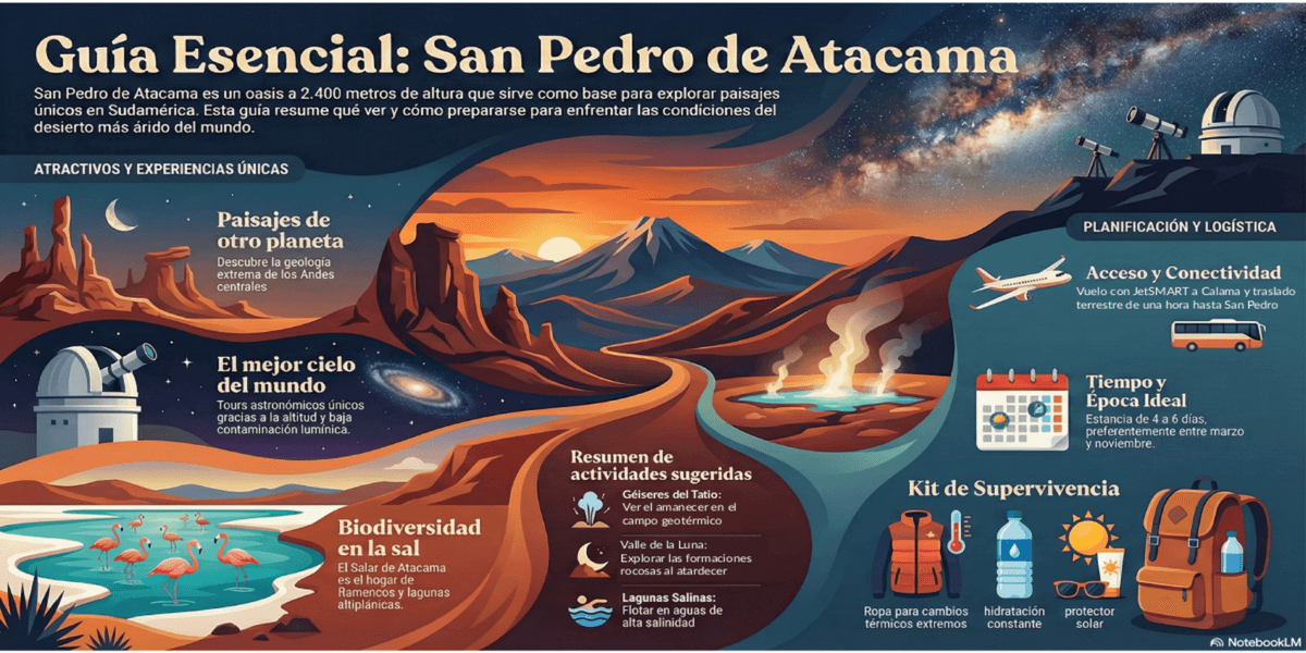San Pedro de Atacama es uno de los destinos más impactantes de Chile. Ubicado en pleno desierto, combina paisajes extremos, cultura ancestral y experiencias que se viven mejor con tiempo y buena planificación. Aquí te contamos qué hacer en San Pedro de Atacama, cómo organizar tu itinerario y cuántos días conviene quedarse para disfrutarlo al máximo.