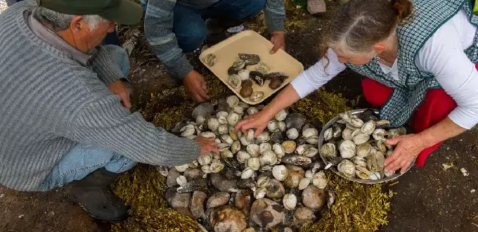 : El curanto es probablemente el plato más representativo de Chiloé. Se prepara tradicionalmente en un hoyo en la tierra donde se cocinan mariscos, carnes, papas, milcaos y chapaleles. Este plato refleja la mezcla cultural y gastronómica del archipiélago.