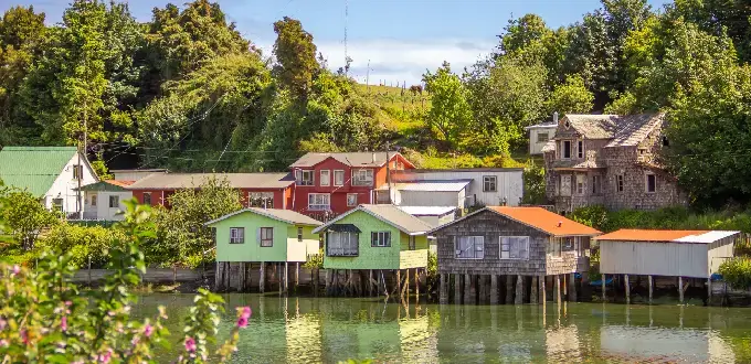 : Los palafitos son una de las imágenes más icónicas de Chiloé. Estas casas construidas sobre pilotes frente al mar reflejan la adaptación de la arquitectura local al entorno costero.